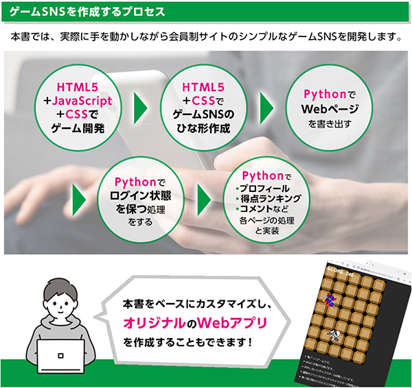 本書では、まず、「HTML5+JavaScript+CSS+jQuery」でミニゲームを開発したり、各Webページの作成などを解説しています。その後は、作成したWebページをもとに、PythonでWebページを書き出したり、データベース「SQLite3」の利用方法などを解説しています。