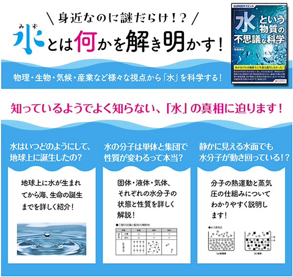 私たちの生活に欠かせない「水」。そもそも水とは何なのか? どのようにして誕生したのか? 水の歴史や科学的な性質はもちろん、地球と生物との関係や環境問題、水を利用した発電の仕組みなど、水という不思議な物質を科学的にくわしく解説します。