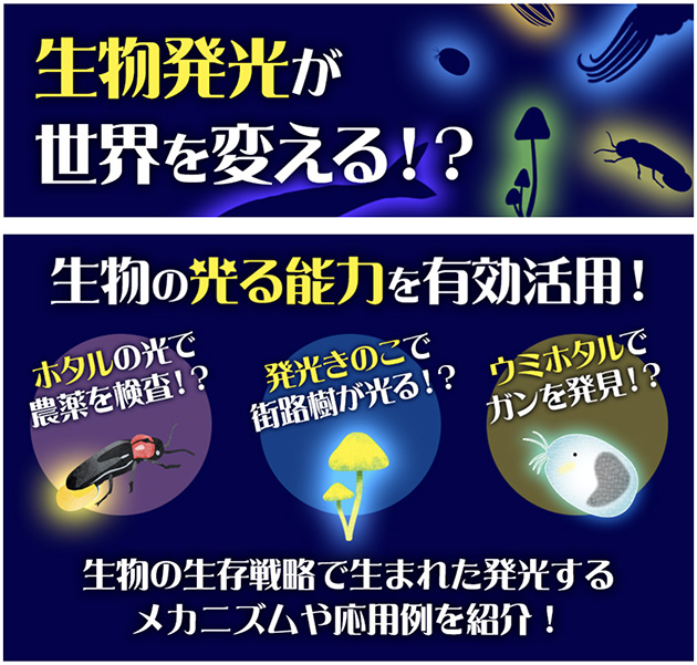 生物発光には無限の可能性が秘められています。その生物発光研究の歴史を含めて、生物学的な多様性や面白さ、発光する原理や仕組みをわかりやすく紹介します。ホタルや発光クラゲ、ウミホタル、発光キノコなどの生物発光システムの応用展開についても詳しく解説します。