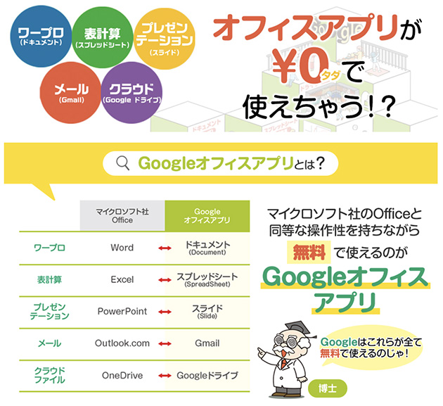 高額なマイクロソフト製のオフィスアプリとほぼ同等の機能と操作性を持ちながら、無料で使えるGoogleオフィスアプリ。この便利なアプリを使いこなしてみませんか?(小林)