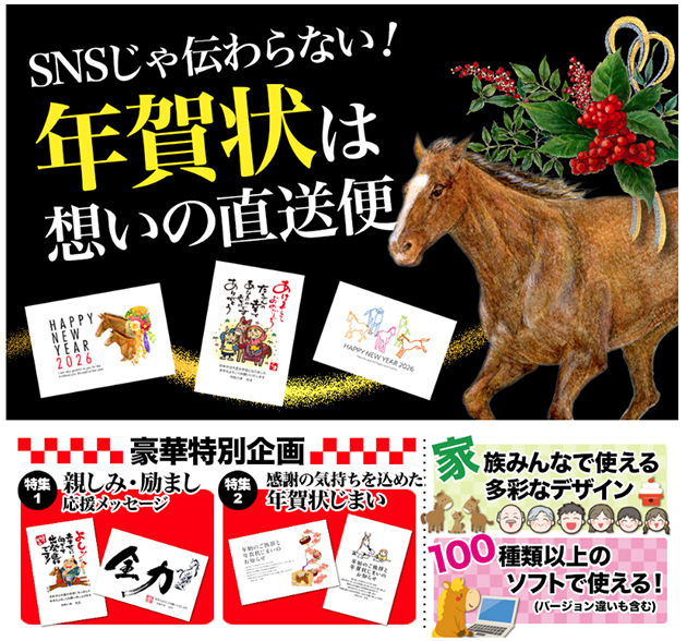 特別企画として、大切な家族や友人の心に響く「親しみ・励まし応援メッセージ年賀状」や長年の親交のお礼と感謝を込めた「年賀状じまいハガキ」を収録しています。他にも、美しい筆文字や干支のイラスト、高精細写真などの素材データも充実しています。