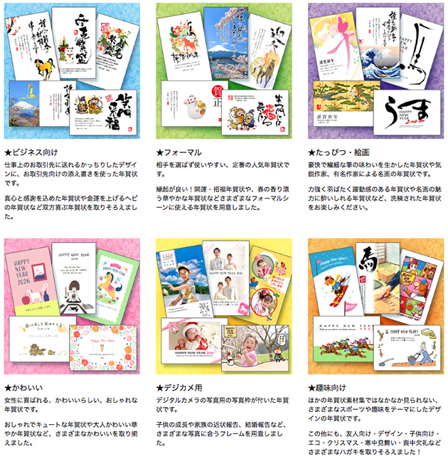 大切な人に送りたい華やかな「フォーマル」や、会社向けに作られた「ビジネス」、流麗な和の心を伝える「たっぴつ・絵画年賀状」、おしゃれなデザインで幸せを届ける「友人向け」「かわいい」「デジカメ用」、個性あふれる「趣味向け」など、今年も『年賀状データ集 PACK PREMIUM』ならではの年賀状がたっぷり!