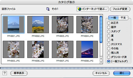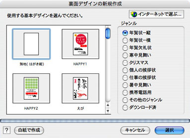 [年賀状−縦]をONにし、[無地(はがき縦)]をクリックして、[選択]ボタンをクリックします。 ※ジャンルは、用途に応じて選択してください。 ![]() |