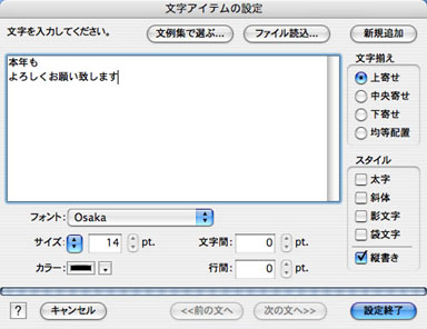 | (5) | 文字を縦書きにしたい場合は、[スタイル]で[縦書き]をONにします(横書きの場合はOFFのまま)。 | ||||||||||||||||||||