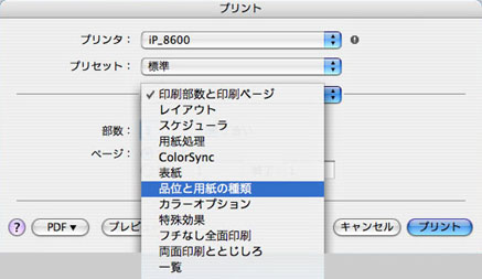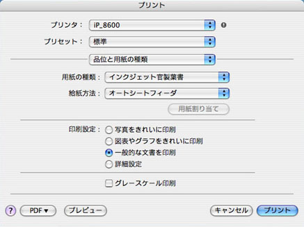 [品位と用紙の種類]を選択し、印刷する素材に合わせて[印刷設定]を設定後、[プリント]ボタンをクリックします。![]() |