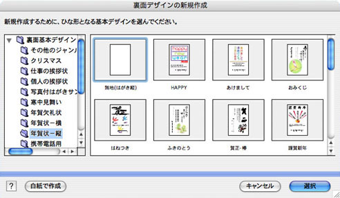 「年賀状−縦」フォルダをクリックし、[無地(はがき縦)]をクリックして、[選択]ボタンをクリックします。 ※フォルダは、用途に応じて選択してください。 ![]() |
