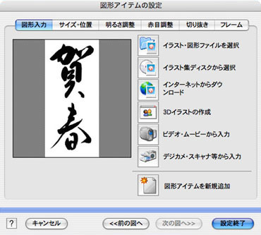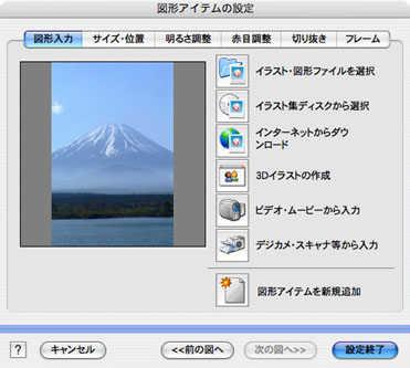 「図形入力」タブをクリックし、[イラスト・図形ファイルを選択]をクリックします。 | ||||||||||||||||||||