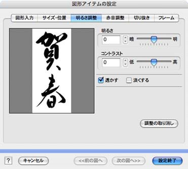 画像まわりを透かす場合は、「明るさ調整」タブをクリックし、[透かす]をONにして、[設定終了]ボタンをクリックします。![]() |