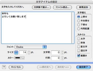 | (5) | 文字を縦書きにしたい場合は、[スタイル]で[縦書き]をONにします(横書きの場合はOFFのまま)。 | ||||||||||||||||||||