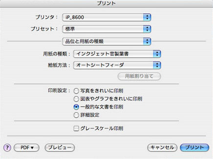 [品位と用紙の種類]を選択し、印刷する素材に合わせて[印刷設定]を設定後、[プリント]ボタンをクリックします。![]() |