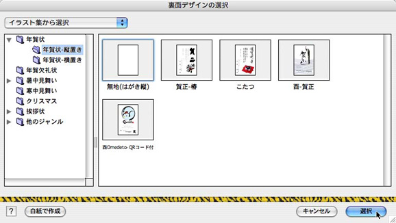 「年賀状−縦置き」フォルダをクリックし、[無地(はがき縦)]をクリックして、[選択]ボタンをクリックします。 ※フォルダは、用途に応じて選択してください。 ![]() |