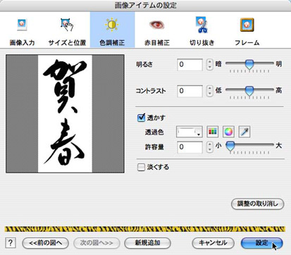 画像まわりを透かす場合は、「色調補正」タブをクリックし、[透かす]をONにして、[設定]ボタンをクリックします。![]() |