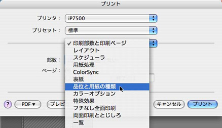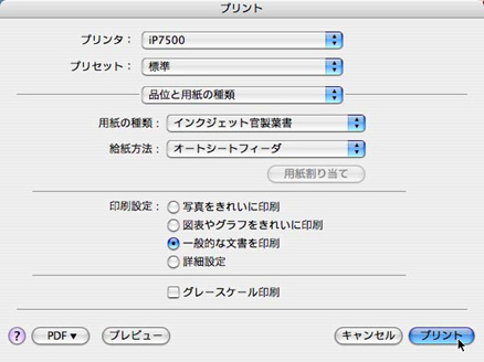 [品位と用紙の種類]を選択し、印刷する素材に合わせて[印刷設定]を設定後、[プリント]ボタンをクリックします。![]() |