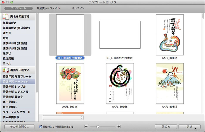 「00_白紙はがき(縦置き)」をクリックして、[選択]ボタンをクリックします。![]() |