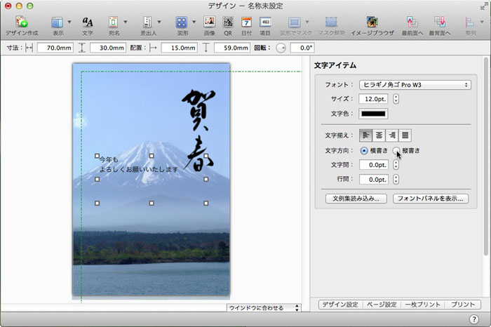 文字の部分をクリックし、[文字方向]で[横書き]または[縦書き]を選択します。![]() |