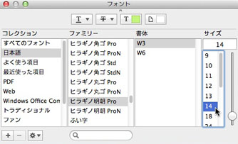 文字の書体を変える場合は、[フォントパネルを表示]ボタンをクリックし、フォントパネルの[ファミリー]からフォントの種類を選択し、[サイズ]から文字のサイズを選択します。設定が終わったらフォントパネルは閉じておいてかまいません。![]() |
