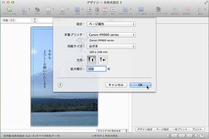 [対象プリンタ]からプリンタを選択し、[用紙サイズ]から「はがき」を選択して、[OK]ボタンをクリックします。![]() |
