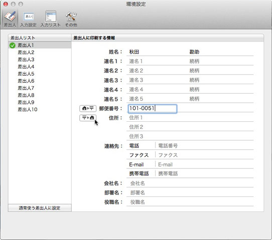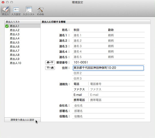 | (5) | 番地を入力し、[通常使う差出人に設定]ボタンをクリックします。この後、「環境設定」ダイアログボックスを閉じておきます。![]() |
