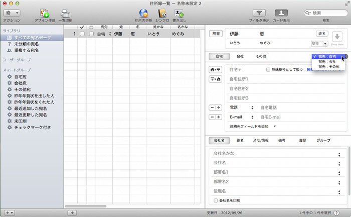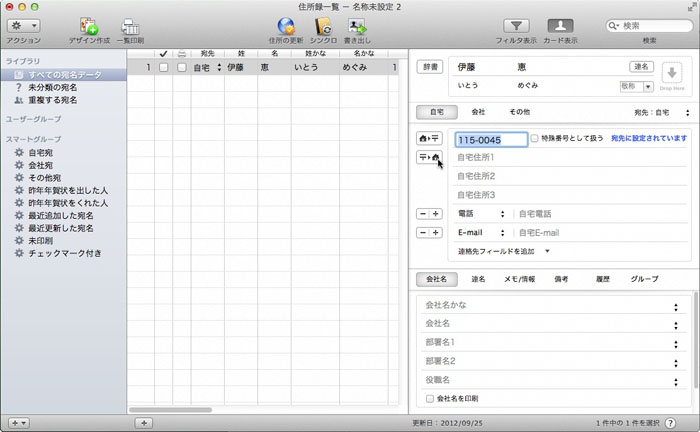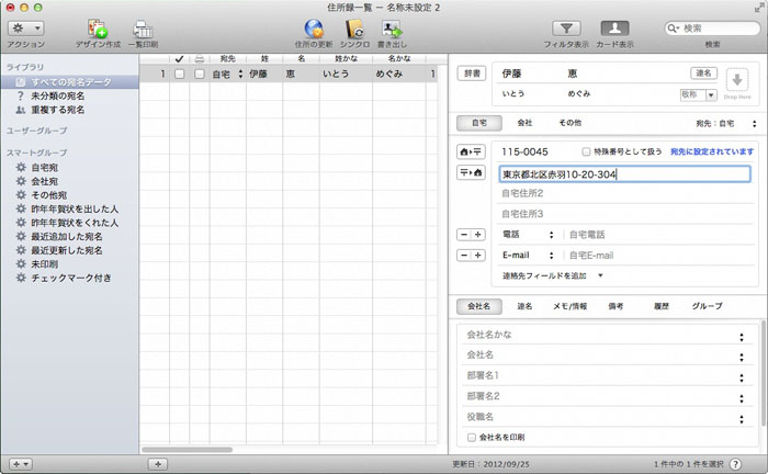 [ファイル]→[新規宛名データを追加]を選択し、他の宛先を入力します。入力が完了したら、住所録カードウィンドウは閉じておいてかまいません。 | ||||||||||||||||||||