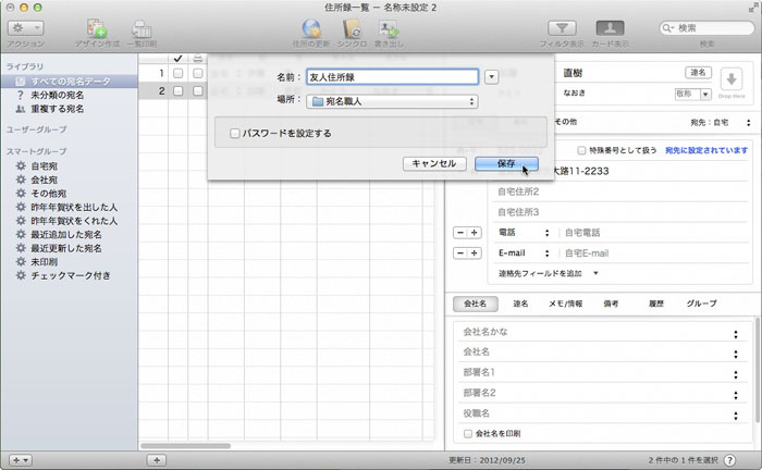 住所録の名前を入力し、[保存]ボタンをクリックします。引き続き宛名面の設定や印刷を行う場合は、住所録一覧のウィンドウは開いたままにしておきます。![]() |