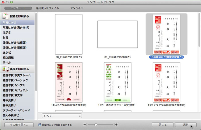[10年賀はがき(縦置き縦書き)]をクリックし、[選択]ボタンをクリックします。![]() |