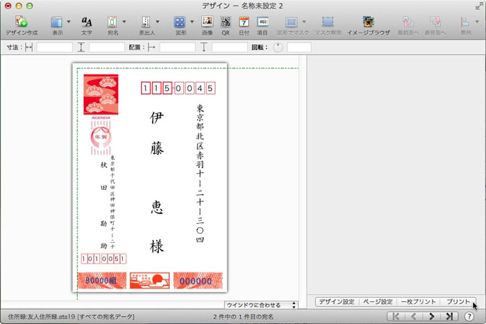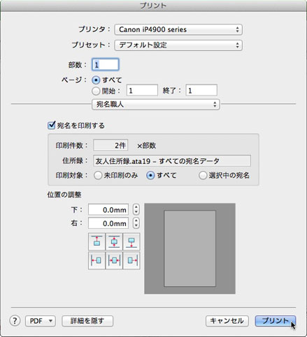 [宛名を印刷する]をONにし、[すべて]をONにして、[プリント]ボタンをクリックします。必要があればこの操作の前に印刷品質の設定を行っておいてください。![]() |