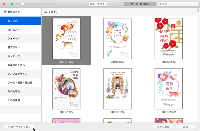[10年賀はがき(縦置き縦書き)]をクリックし、[選択]ボタンをクリックします。![]() |