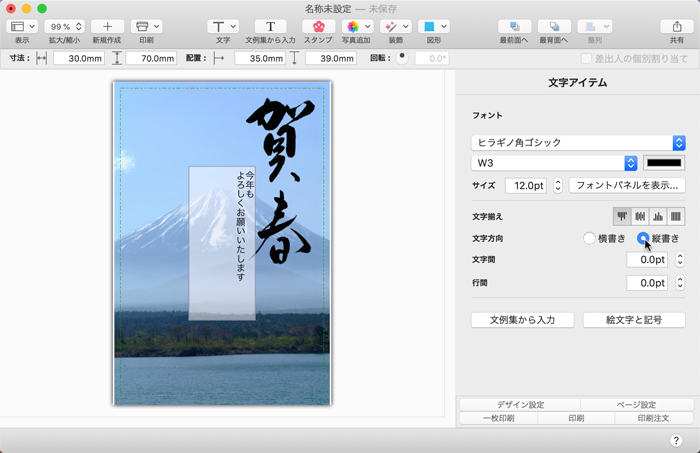 文字の部分をクリックし、[文字方向]で[横書き]または[縦書き]を選択します。![]() |