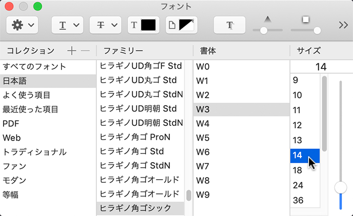 文字の書体を変える場合は、[フォントパネルを表示]ボタンをクリックし、フォントパネルの[ファミリー]からフォントの種類を選択し、[サイズ]から文字のサイズを選択します。設定が終わったらフォントパネルは閉じておいてかまいません。![]() |