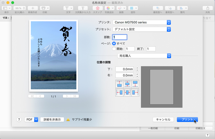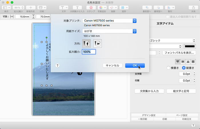 | はがきの文面を印刷するには、次のように操作します。 ※ここでは、Canon製のプリンタ「PIXUS MG7530」を例に解説します。なお、ドライバのインストールなどの準備はすでに終了し、プリンタが利用できる状態にあることとします。 |