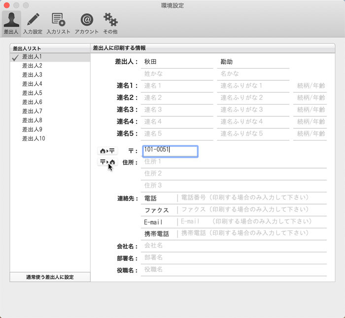 | (5) | 番地を入力し、[通常使う差出人に設定]ボタンをクリックします。この後、「環境設定」ダイアログボックスを閉じておきます。![]() |