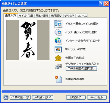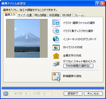 「画像入力」タブをクリックし、[イラスト・画像ファイルの選択]をクリックします。 | ||||||||||||||||||||