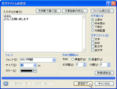 [方向]の[横書き(H)]または[縦書き(J)]をONにして、[設定終了]ボタンをクリックします。![]() |
