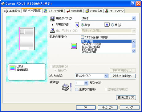 「ページ設定」タブをクリックし、[用紙サイズ(Z)]の一覧から「はがき」を選択して、[OK]ボタンをクリックします。![]() |