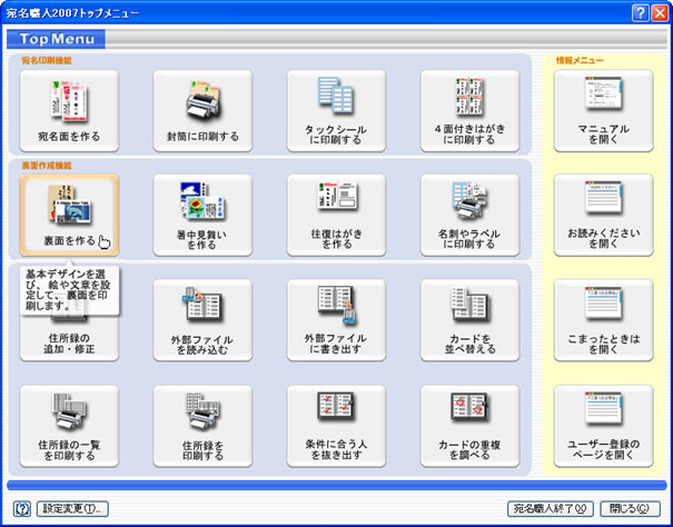 ※このページに掲載している画面は、ソースネクスト版の宛名職人2007の画面になります。ここで紹介している操作に関しては、アジェンダ版の宛名職人2007でも同様に操作できます。