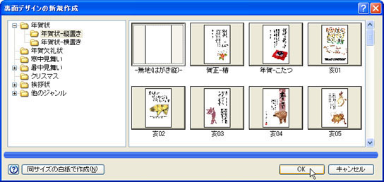 「年賀状-縦置き」フォルダをクリックし、[無地(はがき縦)]をクリックして、[OK]ボタンをクリックします。 ※フォルダは、用途に応じて選択してください。 ![]() |