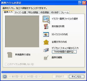 「画像入力」タブをクリックし、[イラスト・画像ファイルの選択]ボタンをクリックします。![]() |