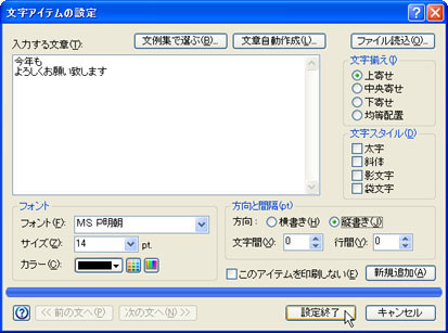 [方向]の[横書き(H)]または[縦書き(J)]をONにして、[設定終了]ボタンをクリックします。![]() |