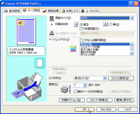 「ページ設定」タブをクリックし、[用紙サイズ(Z)]の一覧から「はがき」を選択して、[OK]ボタンをクリックします。![]() |