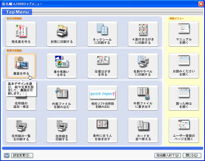 ※このページに掲載している画面は、ソースネクスト版の宛名職人2008の画面になります。ここで紹介している操作に関しては、アジェンダ版の宛名職人2008でも同様に操作できます。