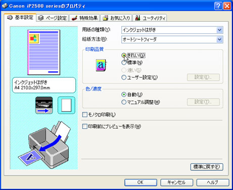 「基本設定」タブをクリックし、[用紙の種類(Y)]の一覧から目的の用紙の種類を選択します。 | ||||||||||||||||||||