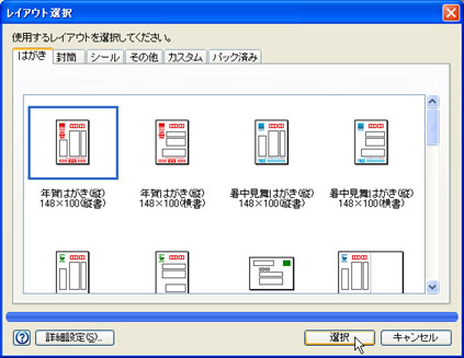 [年賀はがき(縦)148×100(縦書)]をクリックし、[選択]ボタンをクリックします。![]() |