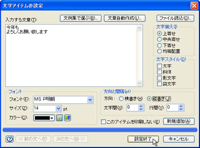 [方向]の[横書き(H)]または[縦書き(J)]をONにして、[設定終了]ボタンをクリックします。![]() |