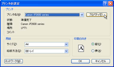 [プリンタ名(N)]でプリンタを選択し、[プロパティ(P)]ボタンをクリックします。![]() |