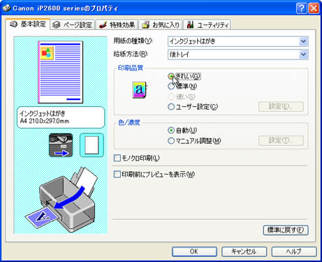 「基本設定」タブをクリックし、[用紙の種類(Y)]の一覧から目的の用紙の種類を選択します。 | ||||||||||||||||||||