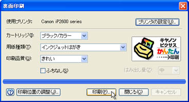 | はがきの文面を印刷するには、次のように操作します。 ※ここでは、Canon製のプリンタ「PIXUS iP2600」を例に解説します。なお、ドライバのインストールなどの準備はすでに終了し、プリンタが利用できる状態にあることとします。 |