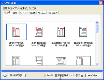 [年賀はがき(縦)148×100(縦書)]をクリックし、[全カードに割当(A)]ボタンをクリックします。![]() |