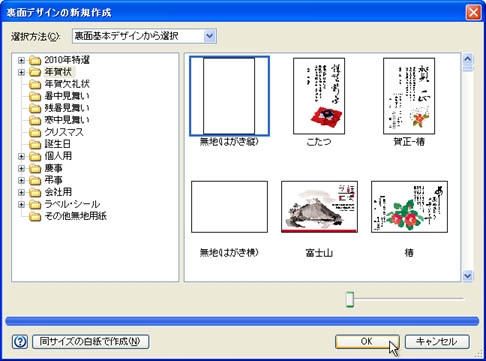 「年賀状」フォルダを選択した状態で、[無地(はがき縦)]をクリックし、[OK]ボタンをクリックします。 ※フォルダは、用途に応じて選択してください。 ![]() |
