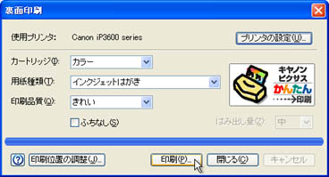 | はがきの文面を印刷するには、次のように操作します。 ※ここでは、Canon製のプリンタ「PIXUS iP2600」を例に解説します。なお、ドライバのインストールなどの準備はすでに終了し、プリンタが利用できる状態にあることとします。 |
