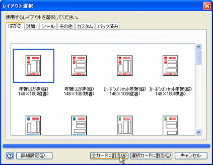 [年賀はがき(縦)148×100(縦書)]をクリックし、[全カードに割当(A)]ボタンをクリックします。![]() |
